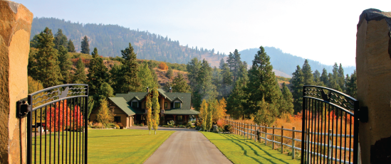 The Floods now enjoy their one-of-a-kind, rustic, free-stacked stone patio fireplace that incorporates local basalt and driftwood elements. Carefully placed plantings create both a sense of openness and a sense of privacy around the estate, and a custom iron gate mounted on basalt columns provides a magnificent entry.