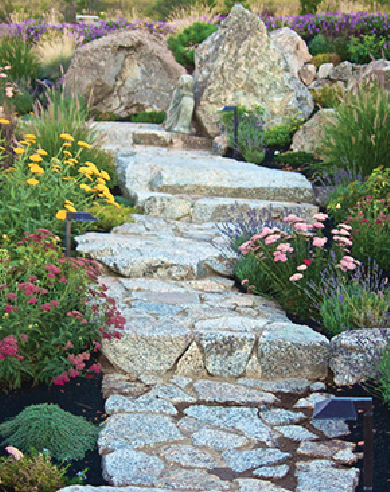 The time and care is worth it, according to the homeowners. Huge boulders now serve as focal points around the property, artful retaining walls, staircases, natural outcroppings on the hillsides and rock-bordered planting areas look like as if they were in place before the house was ever built. “The rock work he did is phenomenal,” says homeowner Tom Dorr.